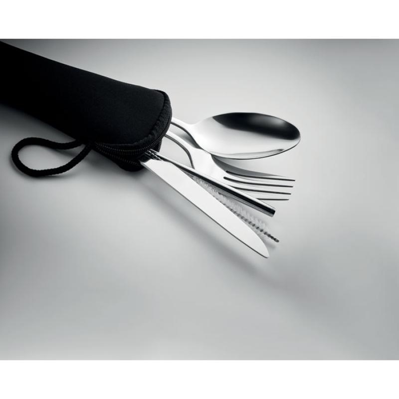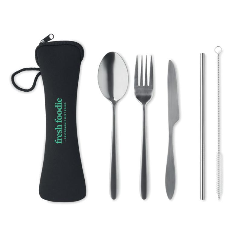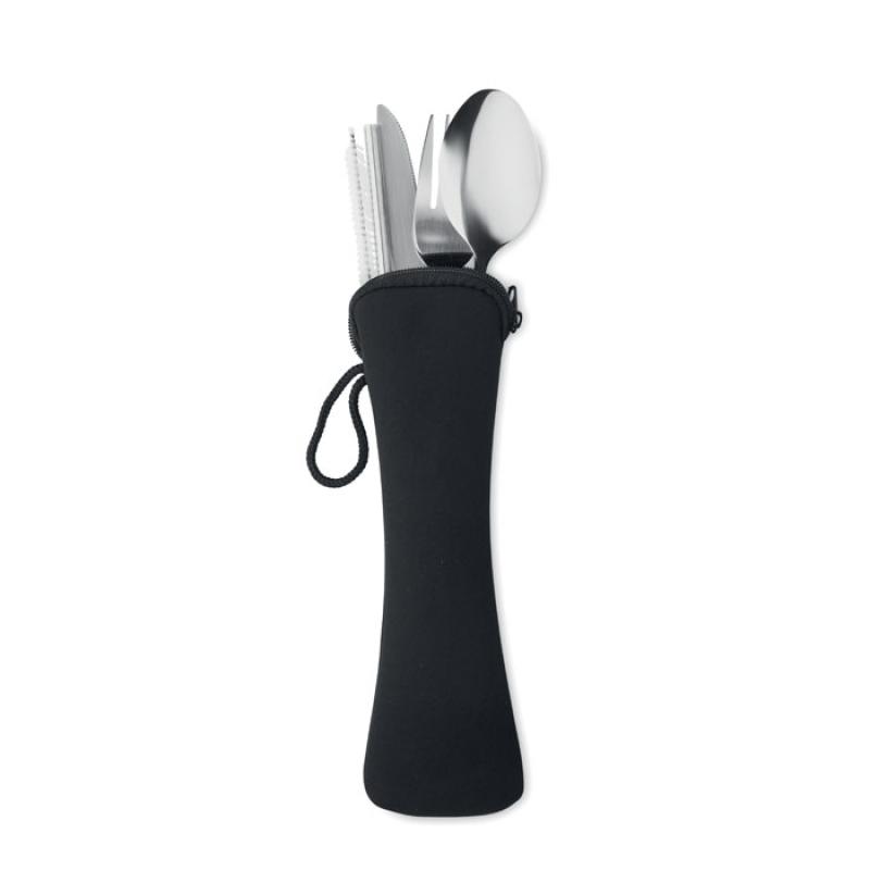 Zestaw sztućców ze stali nierdzewnej wielokrotnego użytku, w tym widelec, nóż, łyżka, słomka i szczotka w etui z neoprenu.