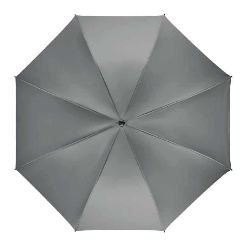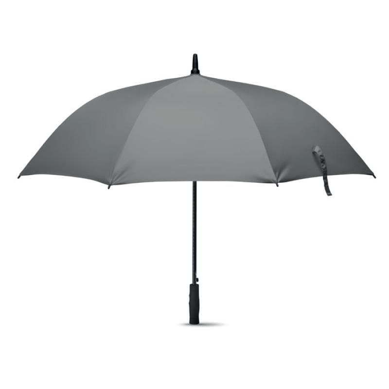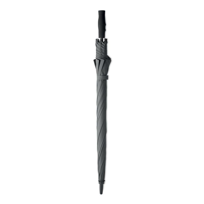 27-calowy, otwierany zamykany, wiatroodporny parasol z tkaniny jedwabnej 190T z trzonkiem i żebrami z włókna szklanego. Czarne plastikowe końcówki i góra. Prosty czarny uchwyt ABS z gumowanym wykończeniem. Zamykany ręcznie.