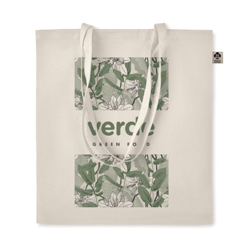 Torba na zakupy bawełny organicznej z długimi uchwytami. Klasyczna torba na ramię przeznaczona do przenoszenia codziennych artykułów spożywczych lub innych przedmiotów. Noś torbę w rękach lub na ramieniu za pomocą długich uchwytów. Uszyta w 100% z naturalnej bawełny organicznej 140 gr / m². Ten produkt posiada certyfikat OEKO-TEX® STANDARD 100.