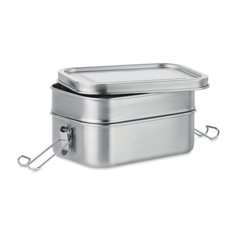 Pojemnik na drugie śniadanie ze stali nierdzewnej, 2 komory z mocnymi i bezpiecznymi klamrami bocznymi. Pojemność 1200 ml.