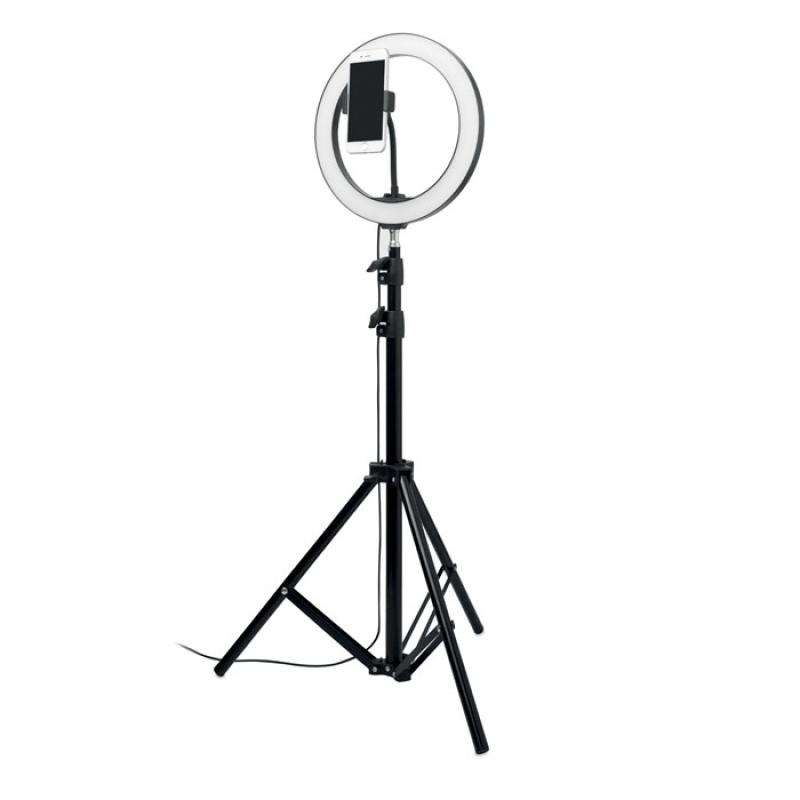Lampa pierścieniowa LED 26 cm selfie z podstawką na statyw i uchwytem na telefon. Idealna do tik-tok®, live-streamingu, transmisji i fotografii. W komplecie z przewodową migawką. Białe, ciepłe, światło (120 LED) z 10 poziomami jasności. Statyw można rozłożyć do maksymalnej wysokości 173 cm.