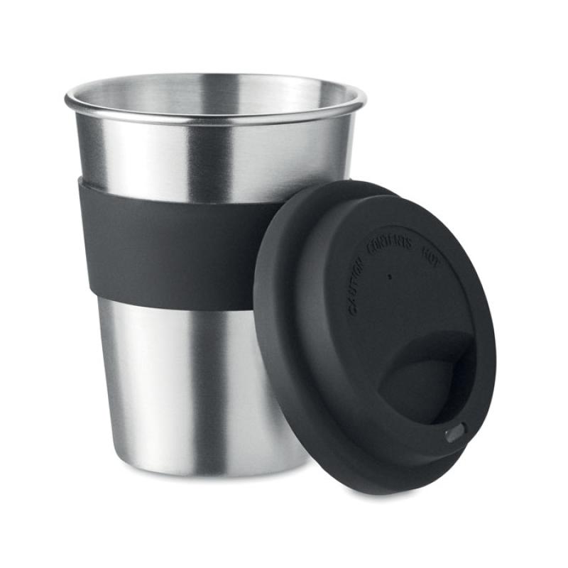 Jednościenny kubek ze stali nierdzewnej z silikonową pokrywką i uchwytem. Pojemność 350 ml. Ponieważ jest to kubek z pojedynczą ścianką, może dochodzić do wymiany ciepła.