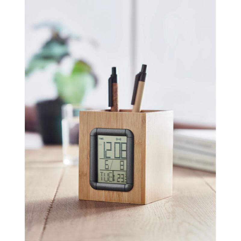 Bambusowy pojemnik na długopisy z kalendarzem, budzikiem i termometrem. Dołączone 2 baterie. Bambus jest produktem naturalnym, dlatego mogą wystąpić nieznaczne różnice w kolorze, wzorze i rozmiarze.
