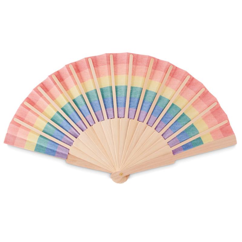 Wachlarz z drewna i tkaniny poliestrowej z tęczowym wzorem.