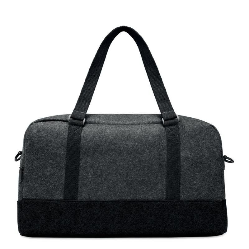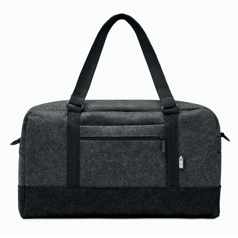 Torba sportowa/fitness lub weekendowa z filcu RPET z przednią kieszenią zapinaną na zamek błyskawiczny, płóciennymi uchwytami i odpinanym, regulowanym paskiem na ramię.