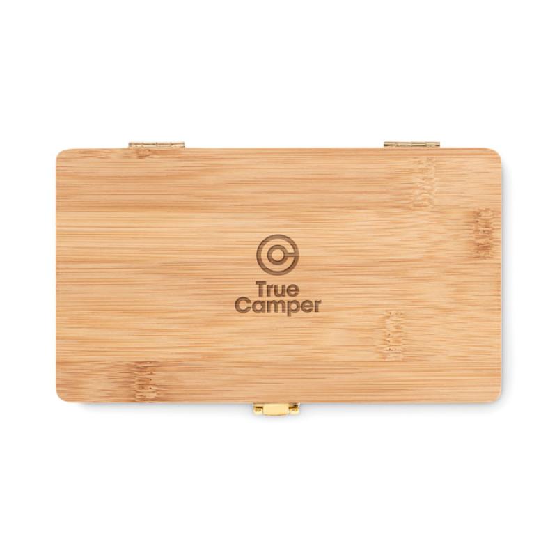 Poręczny 21-częściowy zestaw narzędzi w naturalnym, bambusowym etui. Idealny prezent dla majsterkowicza lub stolarza amatora. W tym przydatnym pudełku znajdują się wszystkie niezbędne narzędzia, które warto mieć w swoim domu na wypadek konieczności napraw lub realizacji małych projektów. Zawiera 3 śrubokręty, 10 bitów w uchwycie, 4 klucze nasadowe, 1 nóż do tapet, 1 uchwyt zapadkowy i 1 łącznik. Bambus jest produktem naturalnym, mogą występować niewielkie różnice w kolorze i rozmiarze poszczególnych elementów, co może mieć wpływ na końcowy efekt dekoracji. Wymiary pudełka 19,5x11,8x3 cm. FSC®-certified | FSC 100%, N5.7, FSC-C213206