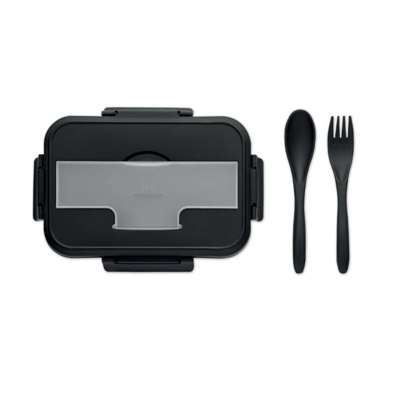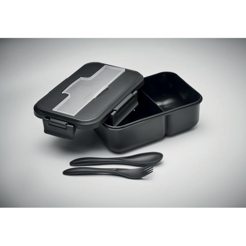 Dwupoziomowy pojemnik na lunch z PP z pasującym zestawem sztućców i uchwytem. Pojemność całkowita: 1000 ml.