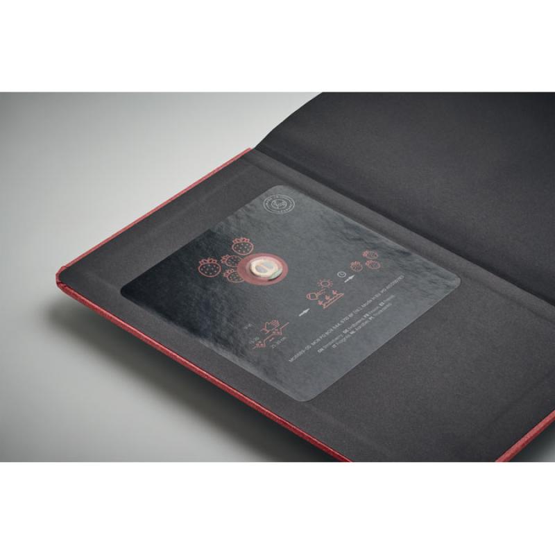 Zeszyt A5 w twardej okładce. 184 strony (92 kartki) w linie. Papier pochodzi z recyklingu. Zakładka z bawełnianej tasiemki. Zawiera nasiona roślin. Wyprodukowano w UE. Ten ekologiczny notatnik doskonale wpisuje się w nurt zrównoważonych produktów promocyjnych. Jest wyjątkowym upominkiem reklamowym. W środku znajdują się nasiona, które możesz zasadzić. Każdemu kolorowi okładki przyporządkowana jest inna roślina. Borówka (04), truskawka (05), biała stokrotka (13), jabłoń (48) oraz sosna (60).