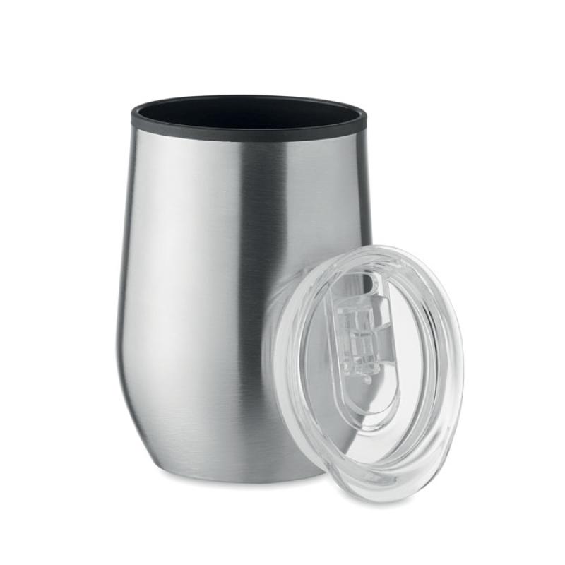 Dwuścienny kubek ze stali nierdzewnej z wewnętrznym PP i przezroczystą pokrywką z PS. Pojemność: 350 ml.