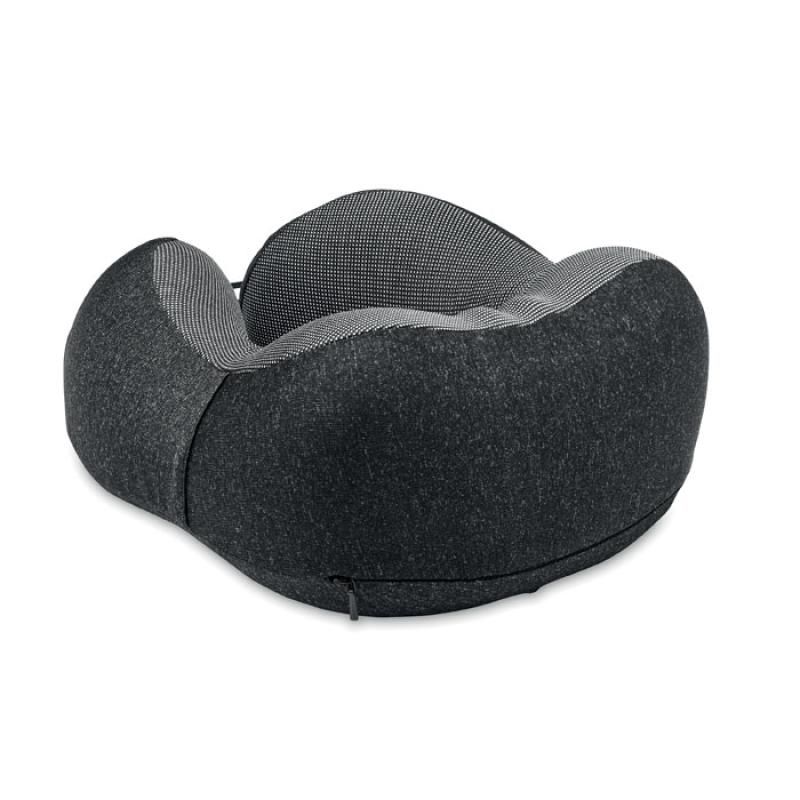 Poduszka podróżna z tkaniny kationowej. W komplecie z torbą z poliestru RPET ze sznurkiem. Często wykorzystywana w samochodzie, pociągu lub samolocie.