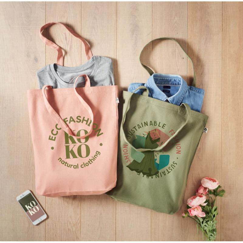 Płócienna torba na zakupy z długimi uchwytami. 270 gr/m². Wykonana z bawełny organicznej. Ten produkt posiada certyfikat OEKO-TEX® STANDARD 100.