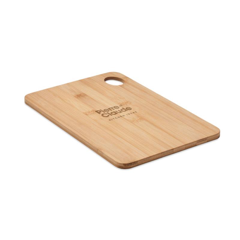 Duża deska do krojenia z drewna bambusowego z otworem do zawieszenia. Bambus jest produktem naturalnym, dlatego mogą wystąpić nieznaczne różnice w kolorze, wzorze i rozmiarze.