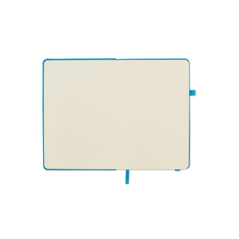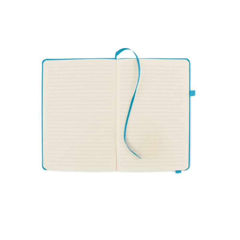 Notatnik A5 z okładką wykonaną w 70% ze skóry pochodzącej z recyklingu i w 30% z lateksowego PU. Obwoluta. 192 stron w linie na papierze z recyklingu (96 arkuszy). Dopasowany elastyczny bawełniany pasek i uchwyt na długopis.