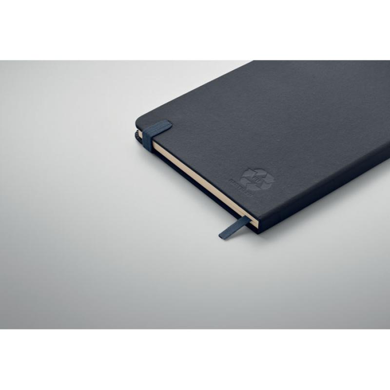 Notatnik A5 z okładką wykonaną w 70% ze skóry pochodzącej z recyklingu i w 30% z lateksowego PU. Obwoluta. 192 stron w linie na papierze z recyklingu (96 arkuszy). Dopasowany elastyczny bawełniany pasek i uchwyt na długopis.
