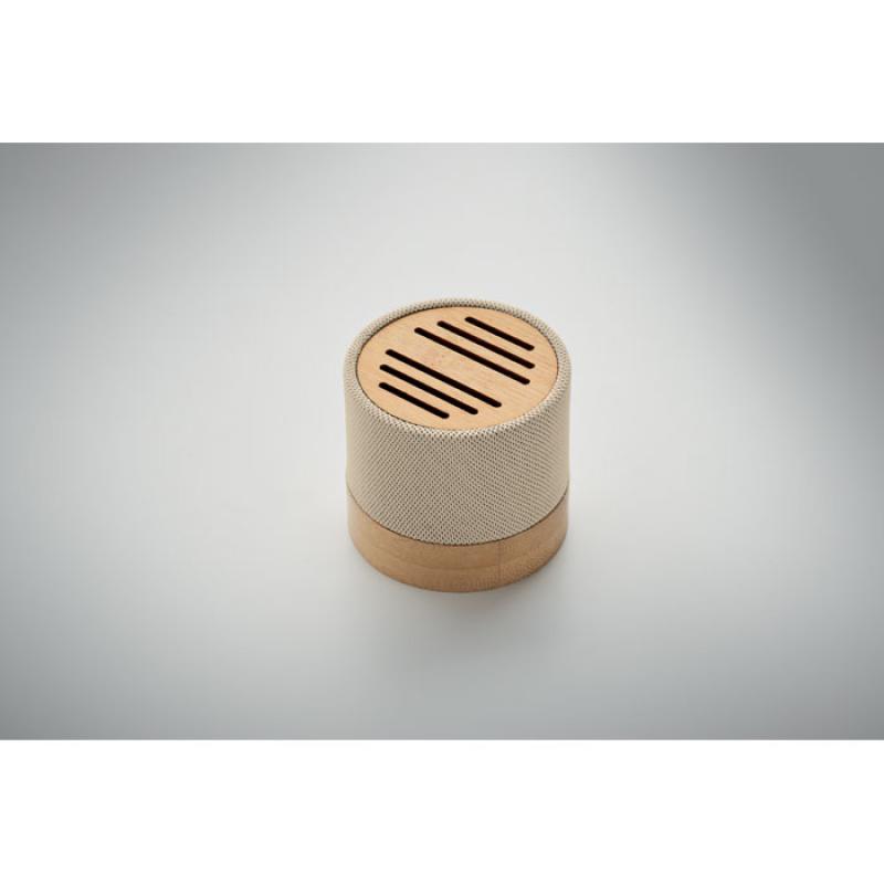 Głośnik bezprzewodowy 5.0 z RPET z bambusowym elementem. Sygnalizacja LED. 1 Akumulator Li-ION 300 mAh. Zawiera port kart SD oraz kabel AUX/USB. Wyjście: 3W, 3 Ohm i 5V. Czas odtwarzania ok. 3h. Bambus jest produktem naturalnym, dlatego mogą wystąpić nieznaczne różnice w kolorze, wzorze i rozmiarze.