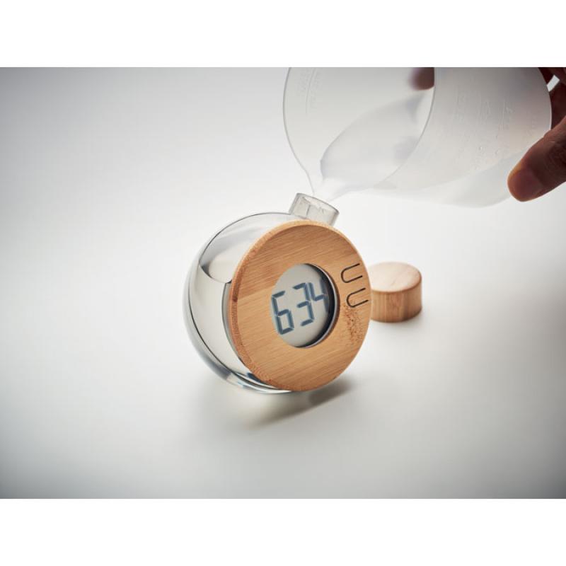 Zegar wodny z duży wyświetlaczem LCD z bambusowymi detalami. Do zasilania wystarczy tylko płyn (słona woda)! Bambus jest produktem naturalnym, dlatego mogą wystąpić nieznaczne różnice w kolorze, wzorze i rozmiarze.