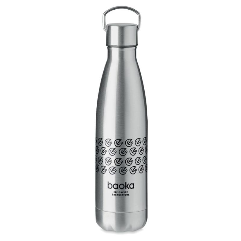 Dwuścienna butelka ze stali nierdzewnej z miedzianymi właściwościami izolującymi próżnię z zakrętką z uchwytem. Pojemność 500 ml. Nie przecieka.