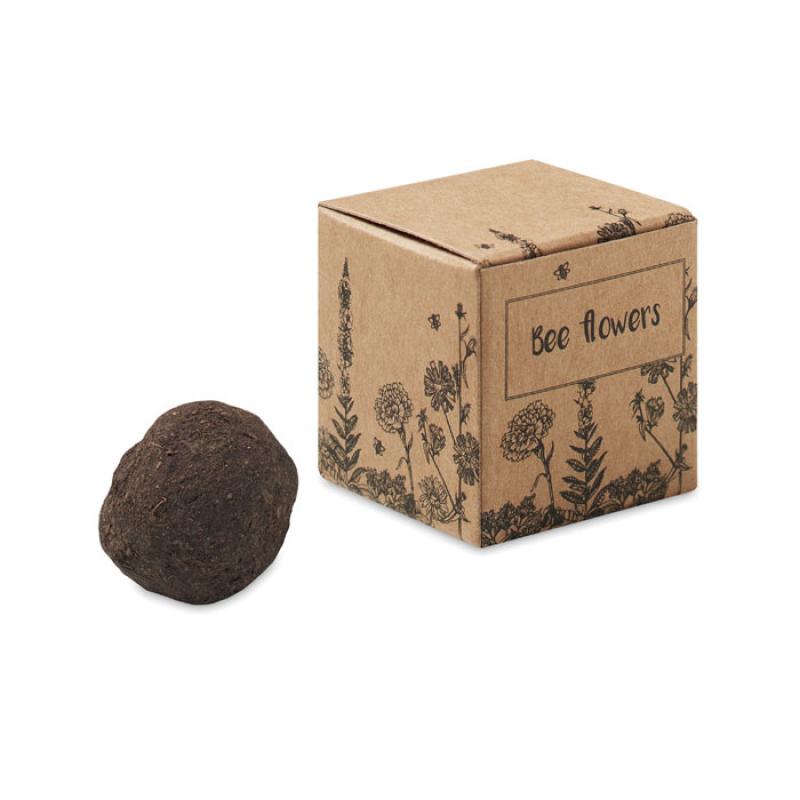 Zestaw do uprawy roślin w formie kuli w kartonowym pudełu. Kula zawiera nasiona kwiatów miododajnych. Wyprodukowano w UE.
