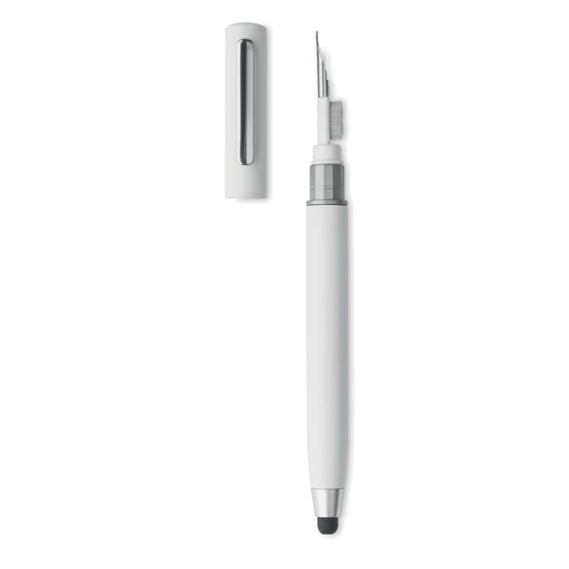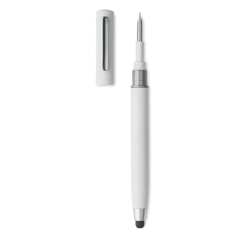 Wykręcany długopis z rysikiem dotykowym z tworzywa ABS. Posiada zestaw do czyszczenia słuchawek dousznych True Wireless Stereo (TWS): metalowy wkład, gąbka i pędzelek. Niebieski tusz.