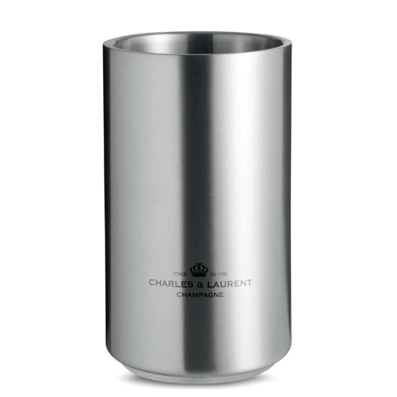 Okragły chłodzący pojemnik ze stali nierdzewnej, z podwójnymi ściankami. Pasuje do butelki wina 750ml.