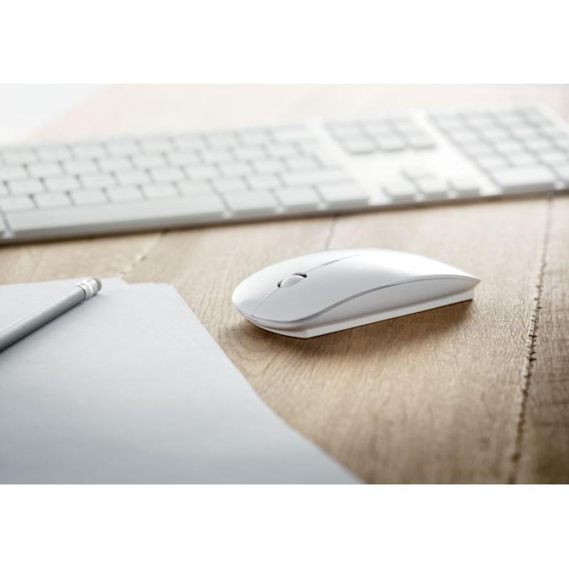 Optyczna myszka bezprzewodowa wykonana z błyszczącego ABS-u. Zasilana 2 bateriami AAA - nie dołączone.