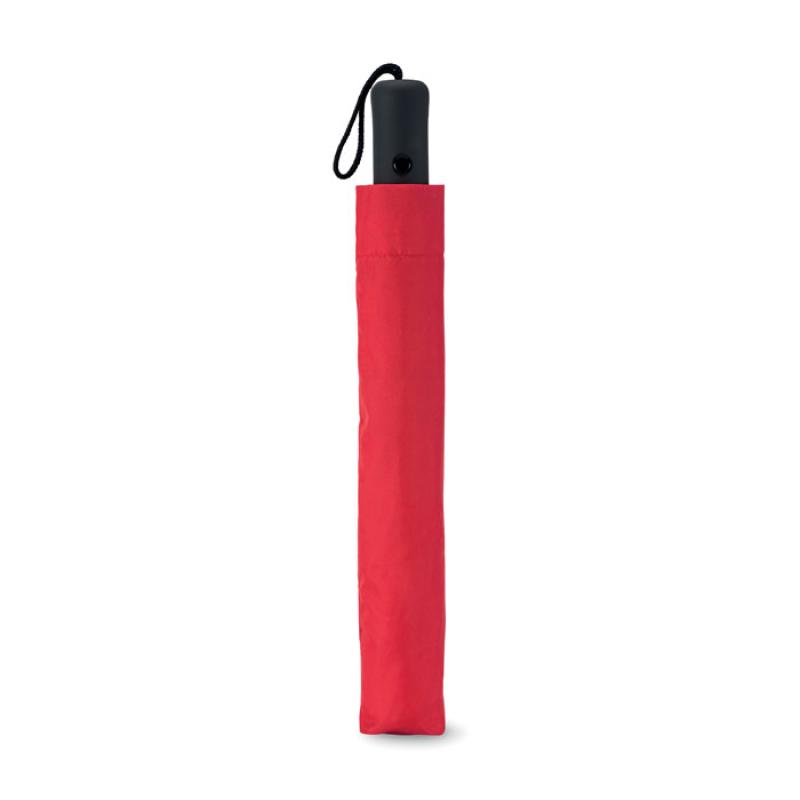 Parasol 21cali, otwierany automatycznie, składany na 2. Wykonany z wysokiej jakości poliestru pongee 190T, trzon, żebra i końcówki ocynkowane. Czarna gumowana rączka z ABS. Posiada dopasowane etui. Zamykany manualnie.