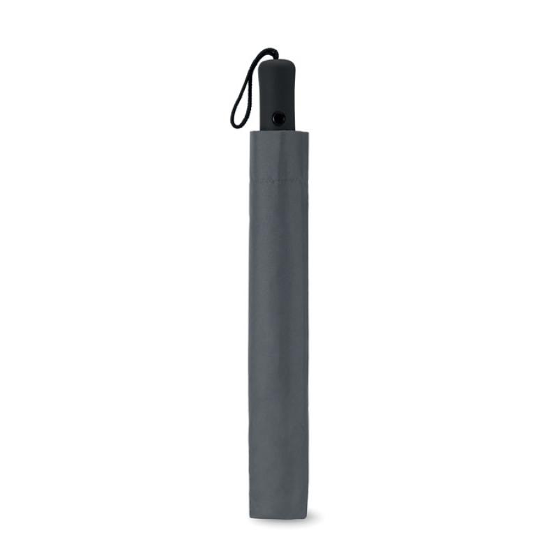 Parasol 21cali, otwierany automatycznie, składany na 2. Wykonany z wysokiej jakości poliestru pongee 190T, trzon, żebra i końcówki ocynkowane. Czarna gumowana rączka z ABS. Posiada dopasowane etui. Zamykany manualnie.