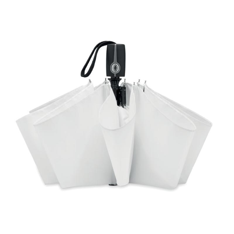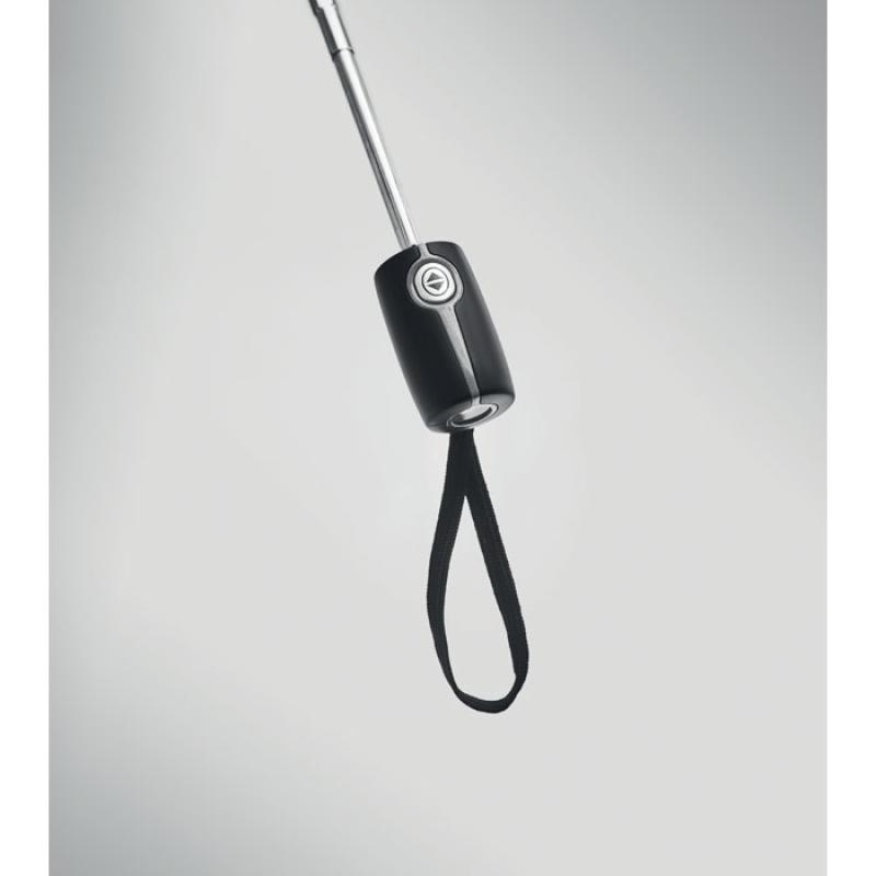 Ekskluzywny 21 calowy automatyczny parasol wykonany z wysokogatunkowego materiału 190T. Trzon metalowy, czarne ożebrowanie 2 sekcyjne wykonane z włókna szklanego zakończenia chromowane. Czarna gumowana rączka z automatycznym zamknięciem.