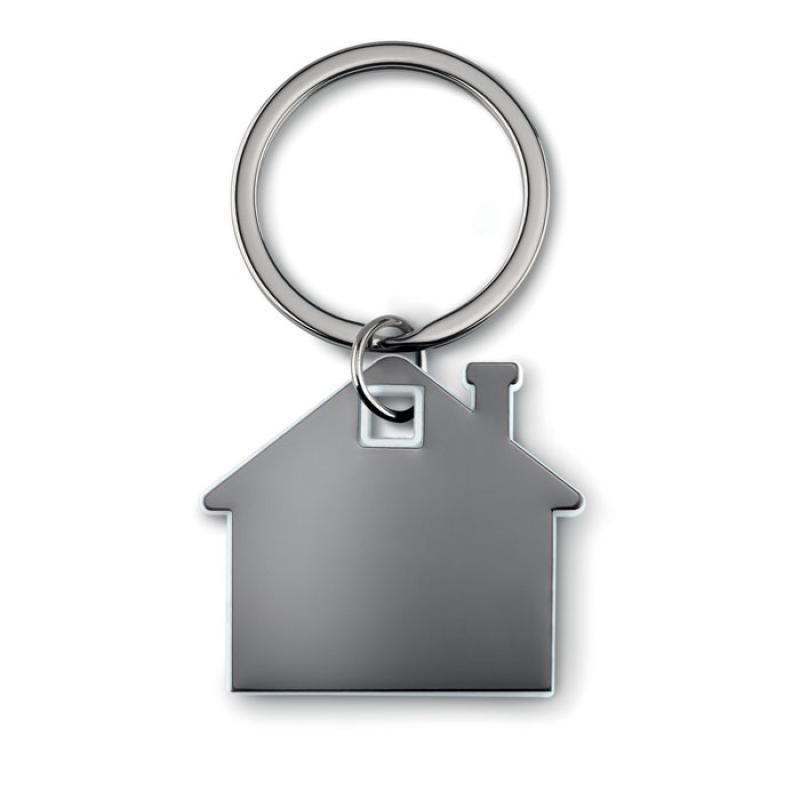 Brelok na klucze w kształcie domku, wykonany ze stali nierdzewnej oraz ABS.