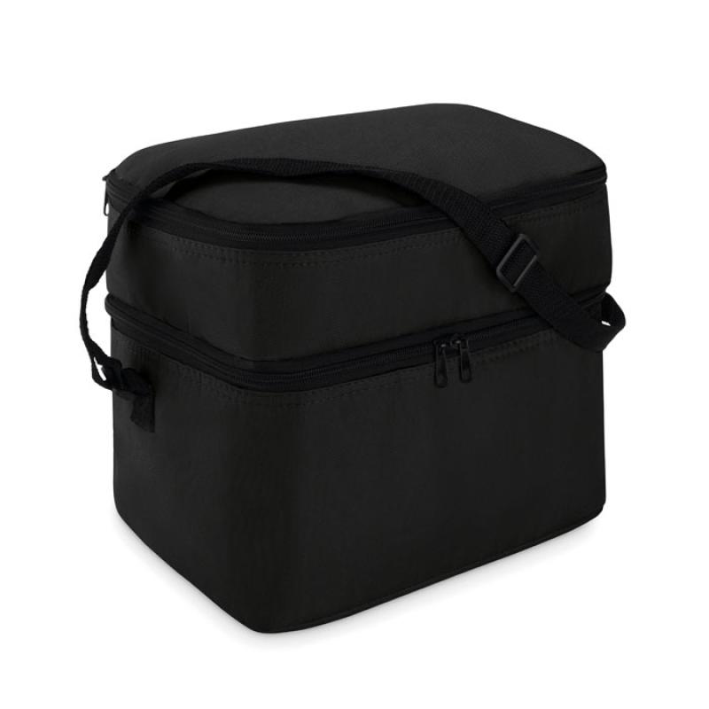 Torba termiczna 600D z 2 przegrodami wyściełanymi folią aluminiową. Posiada regulowany pasek na ramię.
