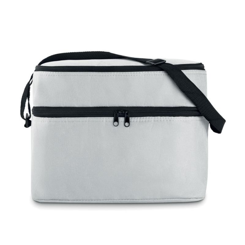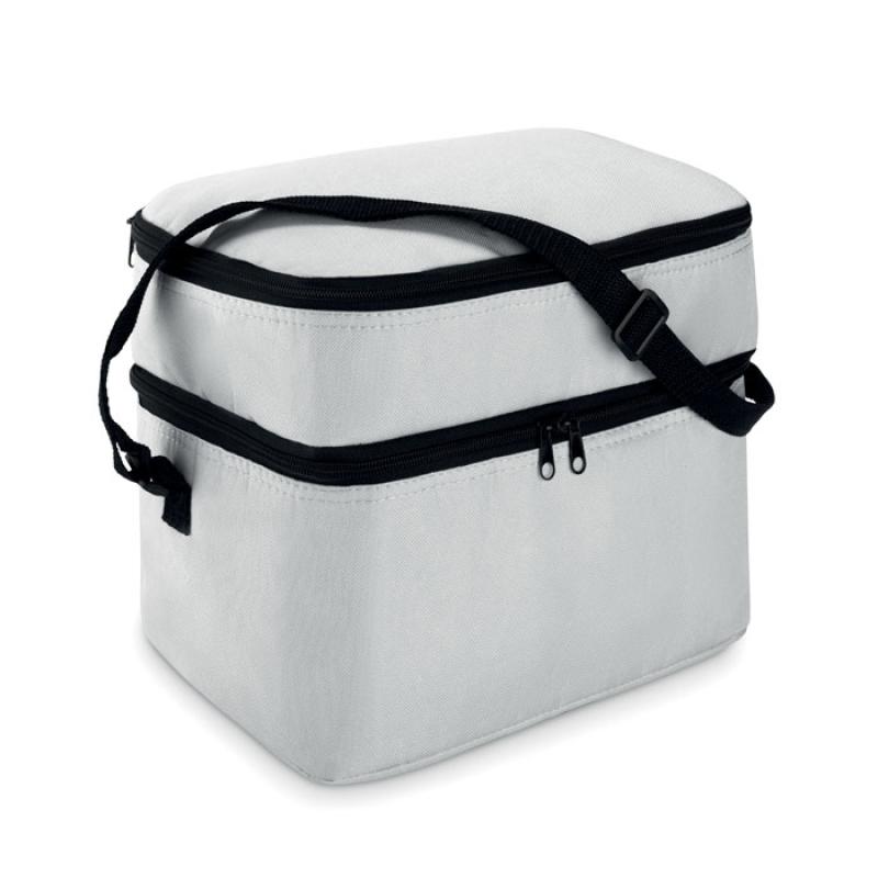 Torba termiczna 600D z 2 przegrodami wyściełanymi folią aluminiową. Posiada regulowany pasek na ramię.