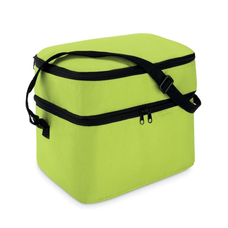 Torba termiczna 600D z 2 przegrodami wyściełanymi folią aluminiową. Posiada regulowany pasek na ramię.
