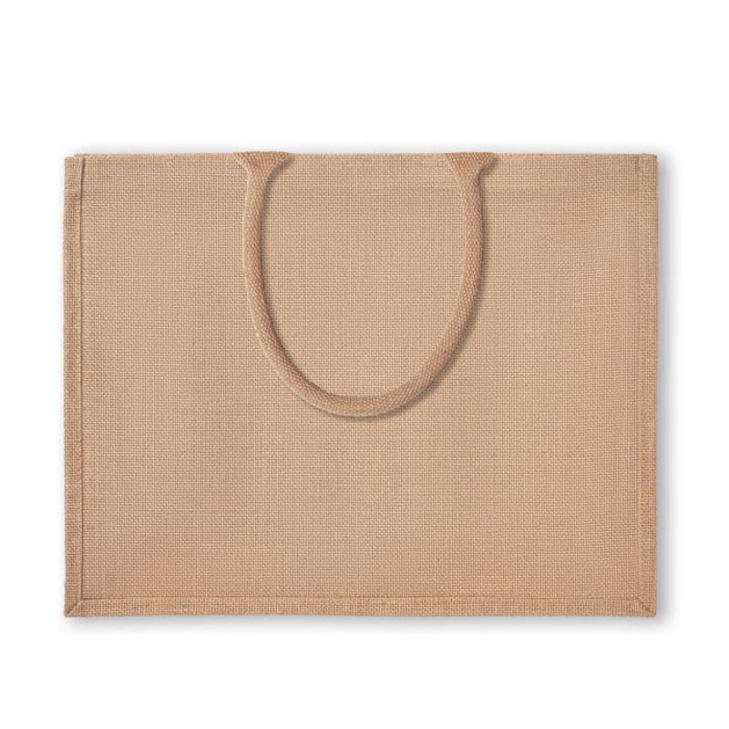 Jutowa laminowana torba na zakupy z krótkimi uchwytami, wykonanymi z bawełny. Ten produkt posiada certyfikat OEKO-TEX® STANDARD 100.