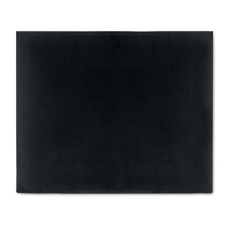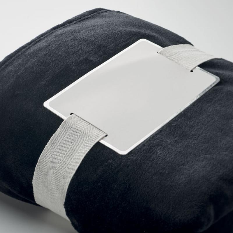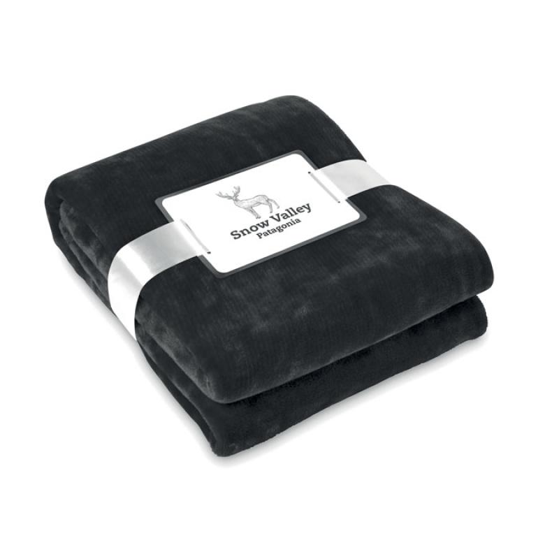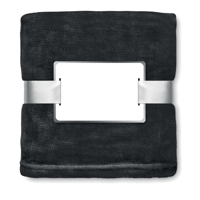 Koc 280g/m² z miłego, miękkiego polaru, przewiązany wstążką, posiada bilecik do nadruku.