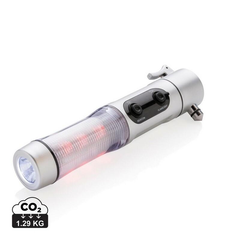 Latarka bezpieczeństwa, obudowa wykonana z ABS, 1 biała dioda LED oraz 9 czerwonych migających na boku, przecinak do pasów, młotek bezpieczeństwa, magnetyczna podstawka do przymocowania do karoserii samochodu