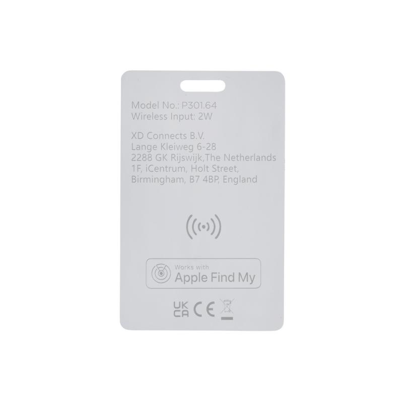 Bezprzewodowy wykrywacz kluczy, lokalizator, wykonany z ABS z recyklingu, kompatybilny ze wszystkimi urządzeniami iOS (aplikacja Apple Find My) oraz z urządzeniami Android (aplikacja Find Hub), wbudowany głośnik umożliwia łatwe znalezienie wykrywacza, czas pracy na jednym ładowaniu baterii do 6 miesięcy, ładowanie bezprzewodowe, wodoodporny IPX5, całkowita zawartość materiałów z recyklingu obliczona na podstawie masy całkowitej produktu: 40%