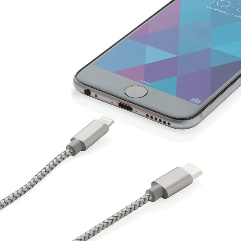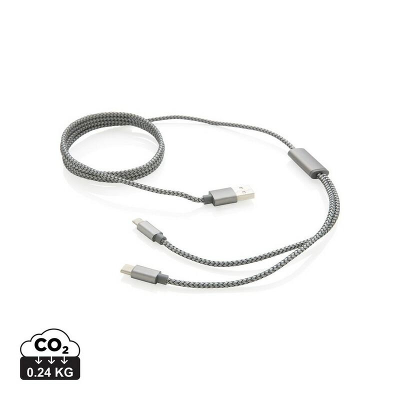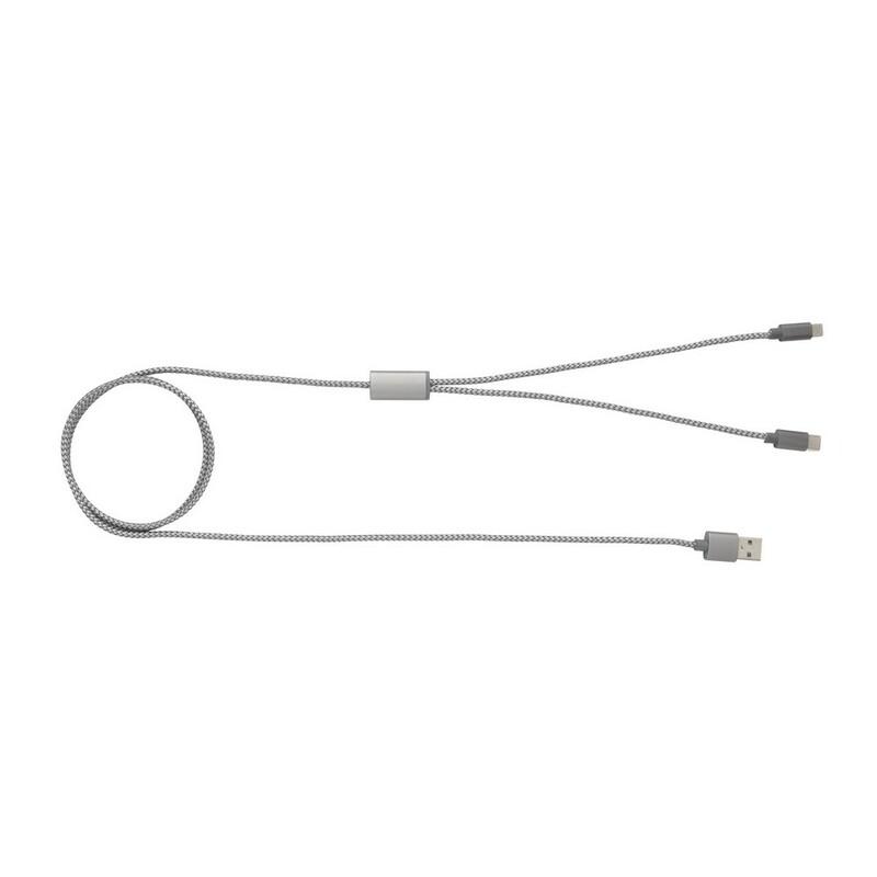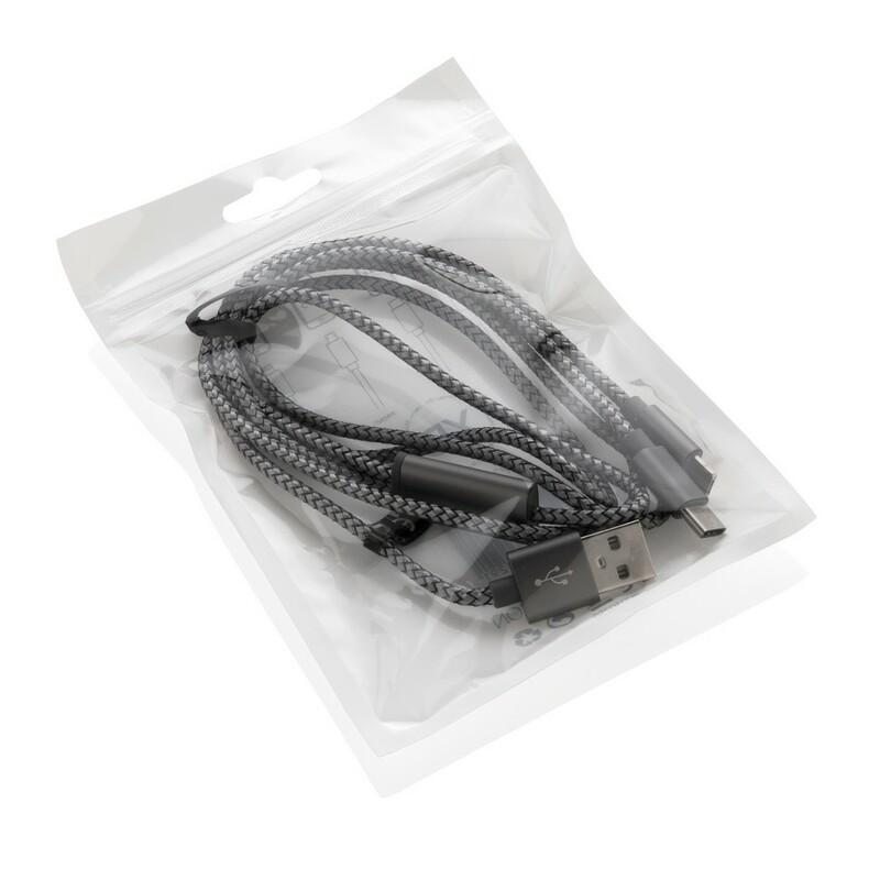 Pleciony kabel do ładowania 3 w 1 z 3 końcówkami: USB, typu C i 2 w 1 (micro USB oraz kompatybilną z urządzeniami iOS), wykonany z plecionego nylonu, długość 120 cm