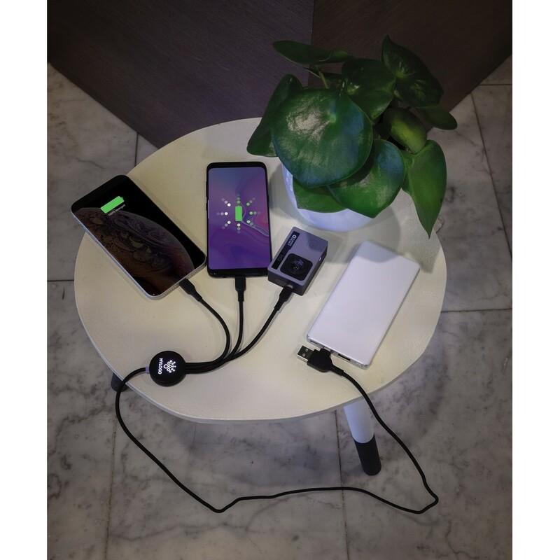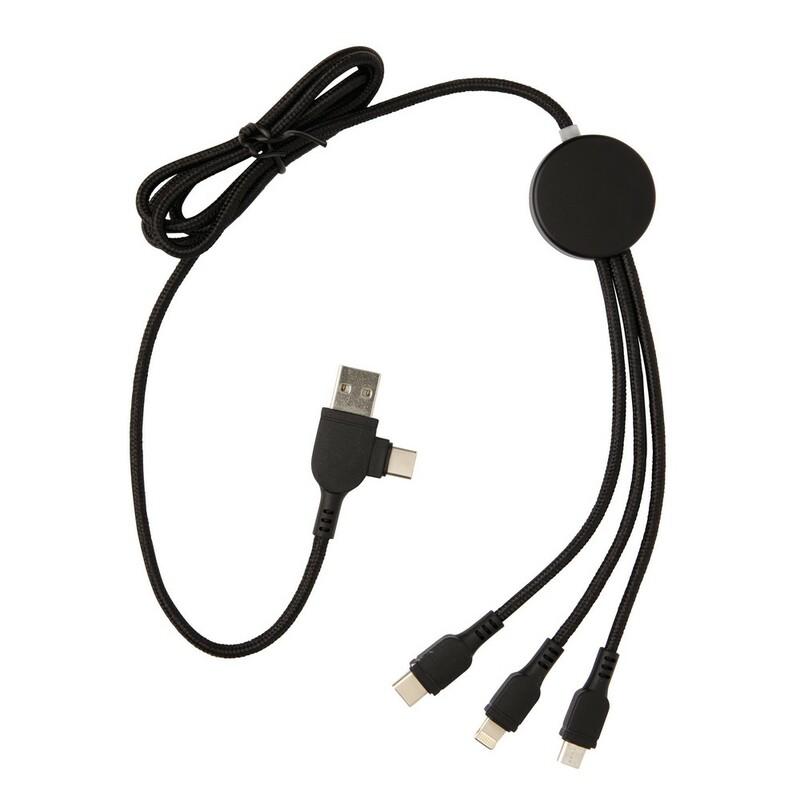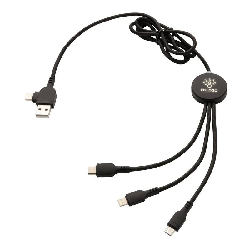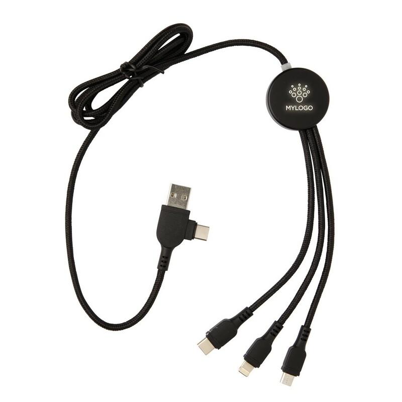 Kabel do ładowania, końcówki: USB, 2 x USB C, micro USB oraz kompatybilna z urządzeniami iOS, grawer ukazuje podświetlaną powierzchnię, obudowa z ABS, długość 120 cm, nie zawiera PVC