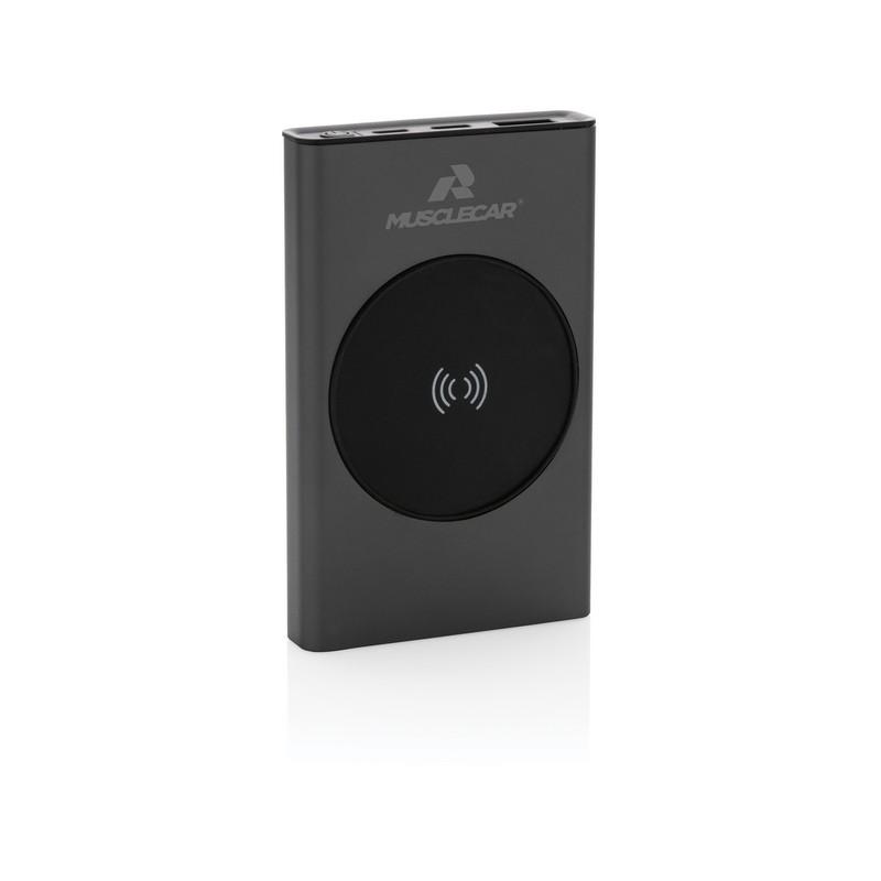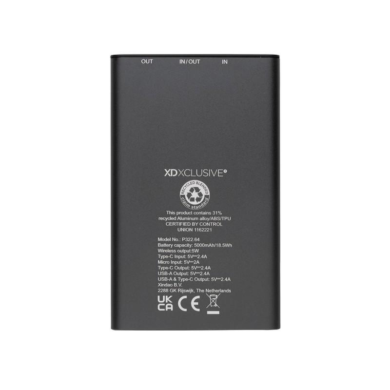 Bezprzewodowy power bank 5000 mAh, wykonany z aluminium i ABS z recyklingu z certyfikatem RCS, całkowita zawartość materiałów z recyklingu obliczona na podstawie wagi całkowitej przedmiotu: 28%, ładowarka bezprzewodowa 5W, diody wskazujące poziom naładowania, wbudowany akumulator litowo-polimerowy klasy A o dużej gęstości i trwałości, bezprzewodowe ładowanie jest kompatybilne ze wszystkimi urządzeniami posiadającymi możliwość ładowania indukcyjnego, wejście micro USB 5V/2A, wejście typu C 2.4a, wyjście typu C 5V/2.4A, wyjście USB 5/2.4A, w pudełku kraftowym z certyfikatem FSC® mix, bez dodatku PVC