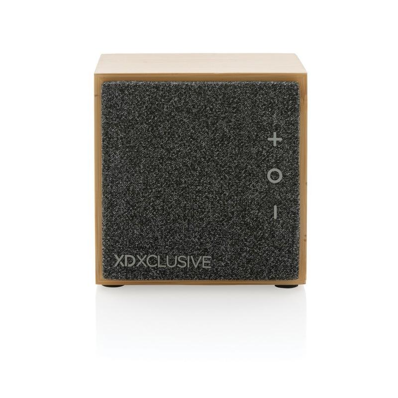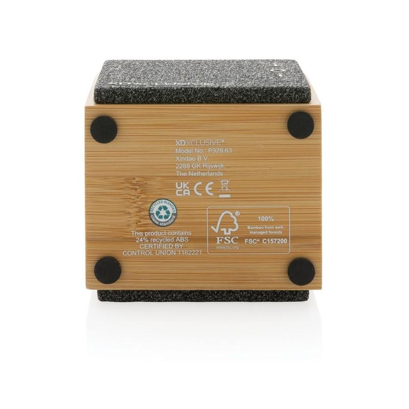 Głośnik bezprzewodowy 5W, BT 5.1 wykonany z bambusa i ABS z recyklingu, zawartość materiałów z recyklingu obliczona na podstawie wagi całkowitej przedmiotu: 24%, akumulator o pojemności 1200 mAh umożliwia odtwarzanie muzyki do 6 godzin, ponowne naładowanie w ciągu 2 godzin, zasięg do 10m, z funkcją odbioru i mikrofonem do odbierania połączeń (wideo), w pudełku kraftowym z certyfikatem FSC® mix, kabel wykonany z TPE z recyklingu w komplecie.