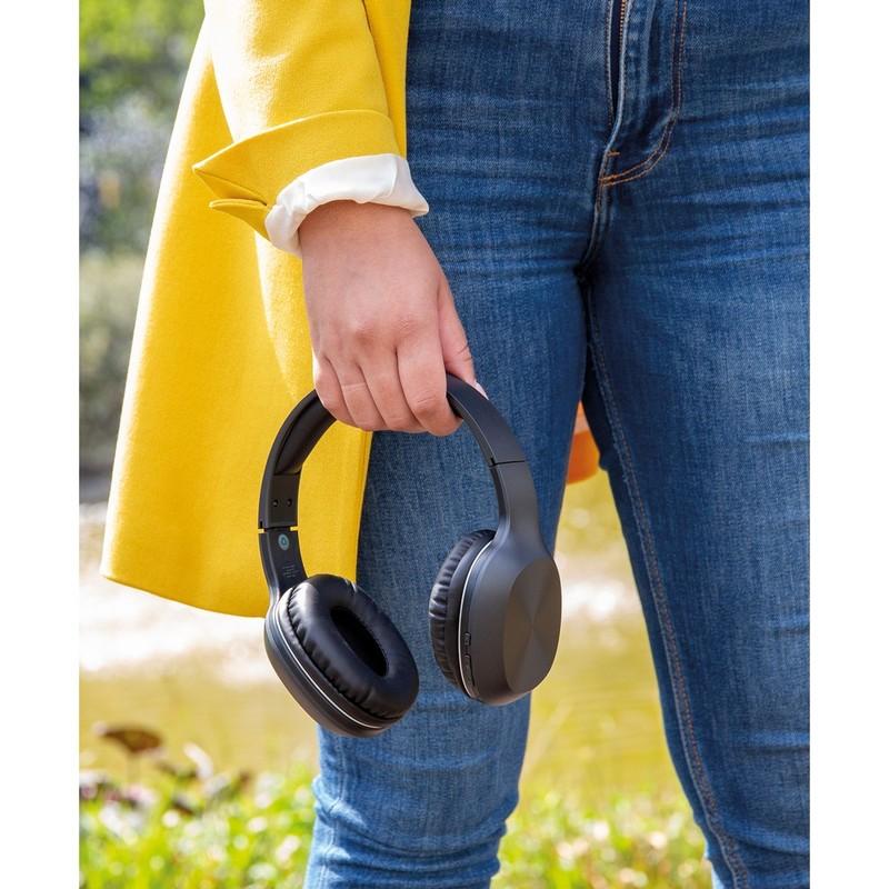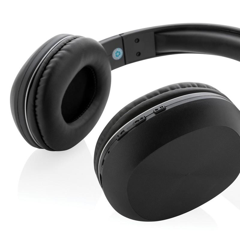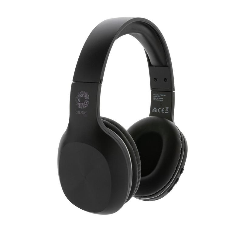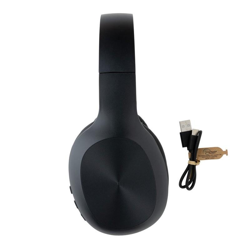 Nauszne słuchawki bezprzewodowe BT 5.1, składane, wykonane z ABS z recyklingu z certyfikatem RCS, całkowita zawartość materiałów z recyklingu obliczona na podstawie wagi całkowitej przedmiotu: 73%, wbudowany mikrofon, funkcja odbierania połączeń, wbudowany akumulator o pojemności 200 mAh umożliwia odtwarzanie muzyki do 5 godzin, ponowne ładowanie w 1,5 godziny, zasięg do 10 m, kabel z TPE z recyklingu w komplecie, w kraftowym pudełku z certyfikatem FSC® mix, nie zawiera PVC