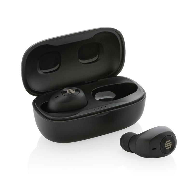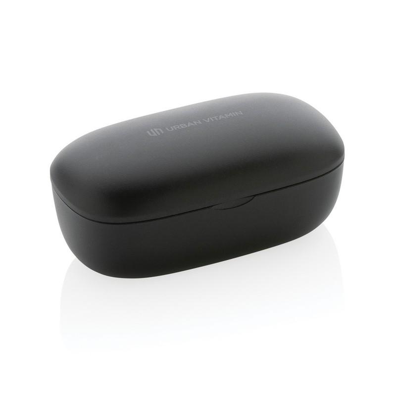 Bezprzewodowe słuchawki douszne, wykonane z ABS z recyklingu z certyfikatem RCS, całkowita zawartość materiałów z recyklingu obliczone na podstawie wagi całkowitej przedmiotu: 55%, funkcja redukcji szumów otoczenia podczas rozmów (ENC), wbudowane 2 mikrofony, funkcja odbierania połączeń, wodoodporne IPX4, dotykowy panel sterowania, do 6 godzin odtwarzania na jednym ładowaniu, etui ładujące zapewnia 20 godzin odtwarzania, nie zawiera PVC, opakowanie o zmniejszonej zawartości plastiku