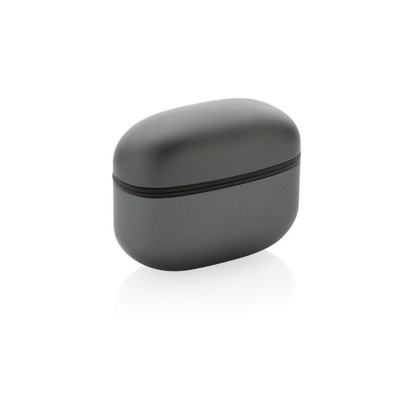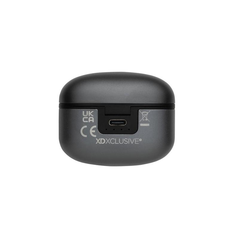 do 5 godzin, ponowne naładowanie za pomocą etui w 1.5 godziny, zasięg do 10 metrów, w pudełku z certyfikatem FSC® mix, kabel USB typu C wykonany z alumunium z recyklingu, TPE oraz PET w komplecie, nie zawiera PVC