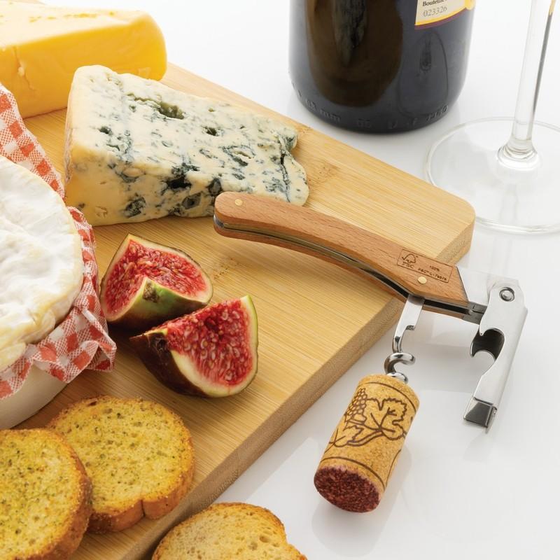 Nóż kelnerski, funkcje: korkociąg, wykonany ze stali nierdzewnej i drewna, nóż do folii, otwieracz do butelek, w ozdobnym pudełku z papieru kraftowego z certyfikatem RCS®