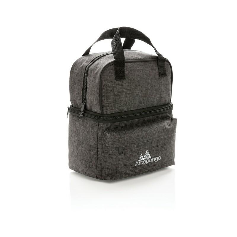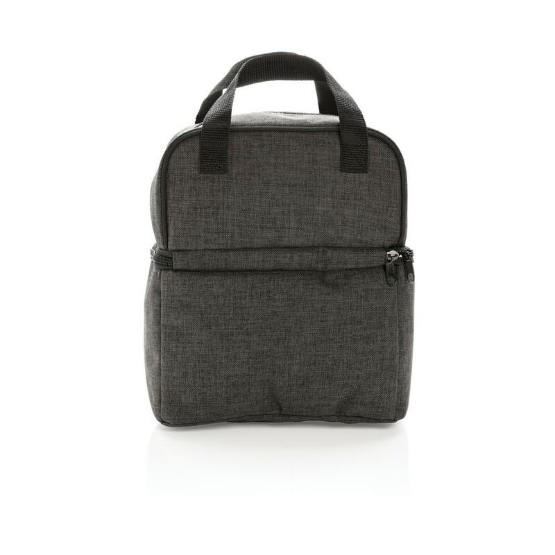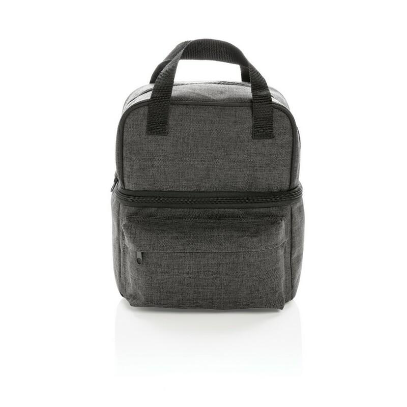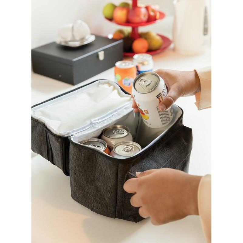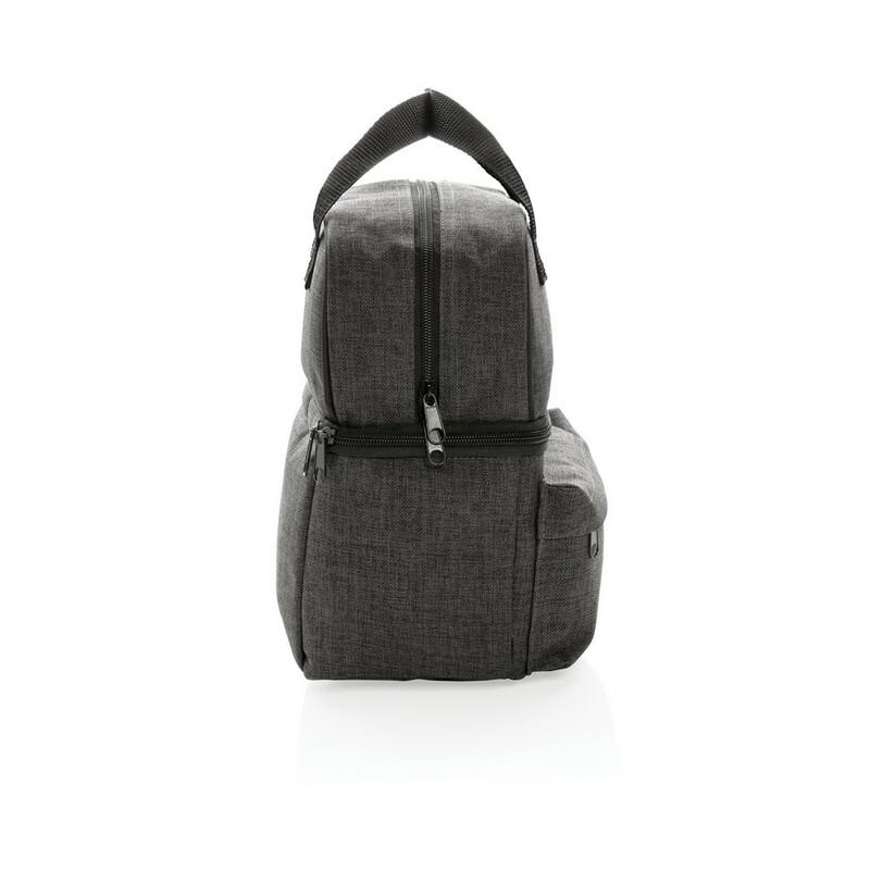 Torba termoizolacyjna z uchwytami i 2 przegrodami, wykonana z poliestru 600D, górna przegroda do owoców i przekąsek oraz dolna przegroda zmieści do 6 puszek 0,33l, przednia kieszeń na zamek błyskawiczny