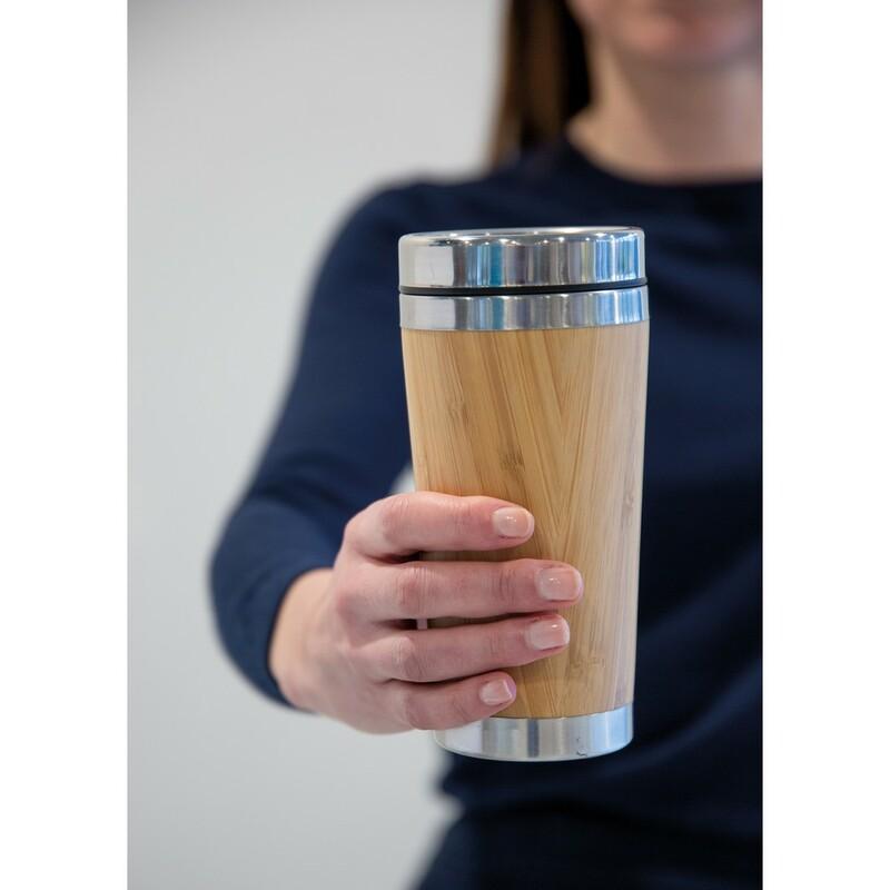 Bambusowy kubek podróżny 450 ml, wnętrze ze stali nierdzewnej 304, powłoka z organicznego bambusa na zewnątrz, utrzymuje temperaturę ciepłych napojów do 3 godzin oraz zimnych do 6 godzin