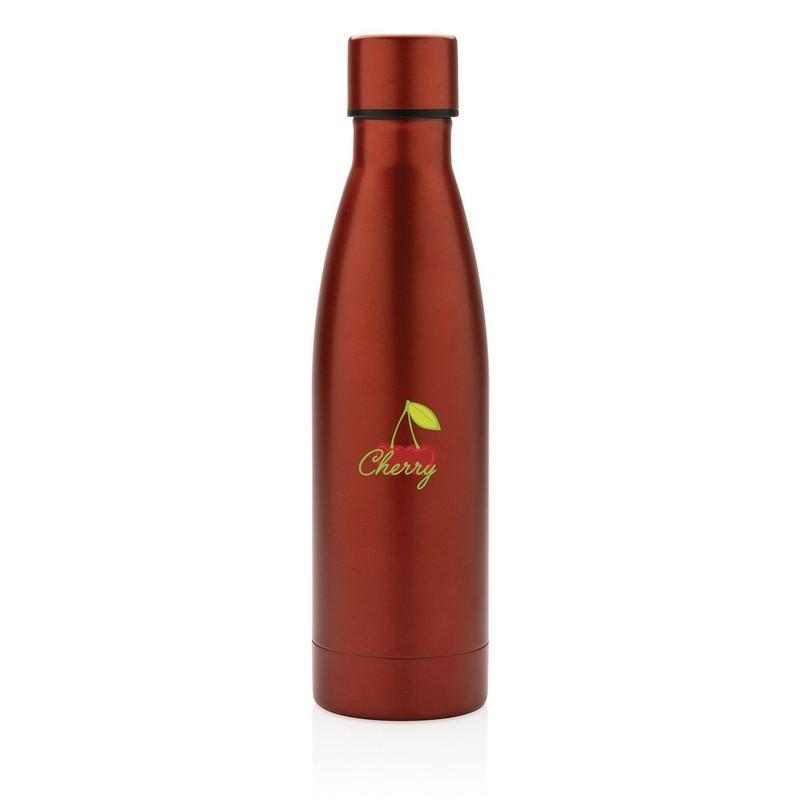 Butelka termiczna 500 ml, podwójne ścianki z próżnią pomiędzy, utrzymuje temperaturę napojów ciepłych do 5 godzin oraz zimnych do 15 godzin, wykonana ze stali nierdzewnej z recyklingu z certyfikatem RCS (Recycled Claim Standard) który gwarantuje, że wykorzystane materiały pochodzą z recyklingu, całkowita zawartość materiału z recyklingu obliczona w oparciu o wagę całkowitą przedmiotu: 93%, pasuje do większości uchwytów samochodowych, w pudełku z papieru kraftowego z certyfikatem FSC® (Forest Stewardship Council)