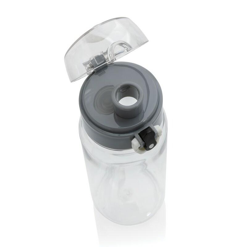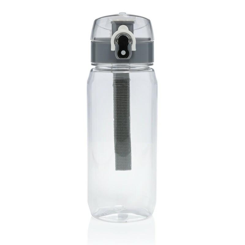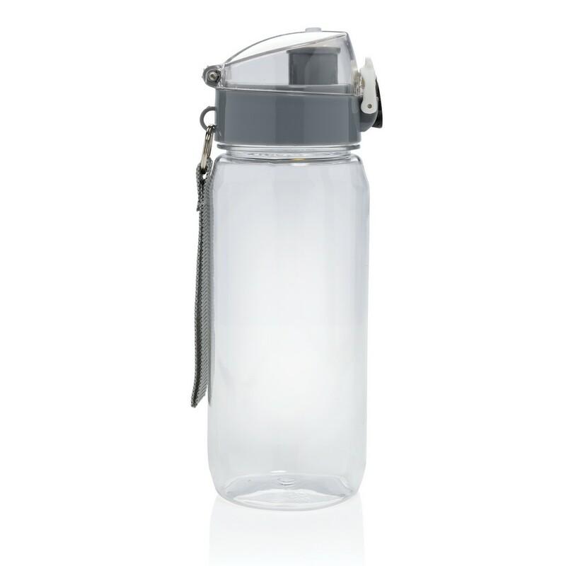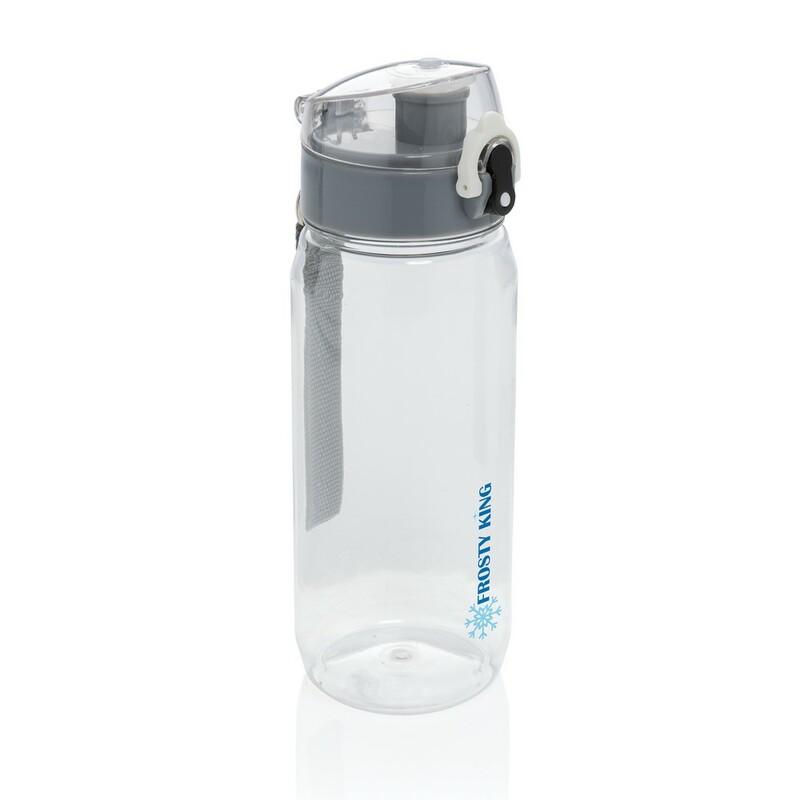 Butelka sportowa 600 ml, wykonana z RPET, całkowita zawartość materiałów obliczona na podstawie wagi całkowitej przedmiotu: 35%, zalecana wyłącznie do zimnych napojów, wyłącznie mycie ręczne, w pudełku z papieru kraftowego z certyfikatem FSC®, ślad węglowy produktu: 0,62 kg CO2