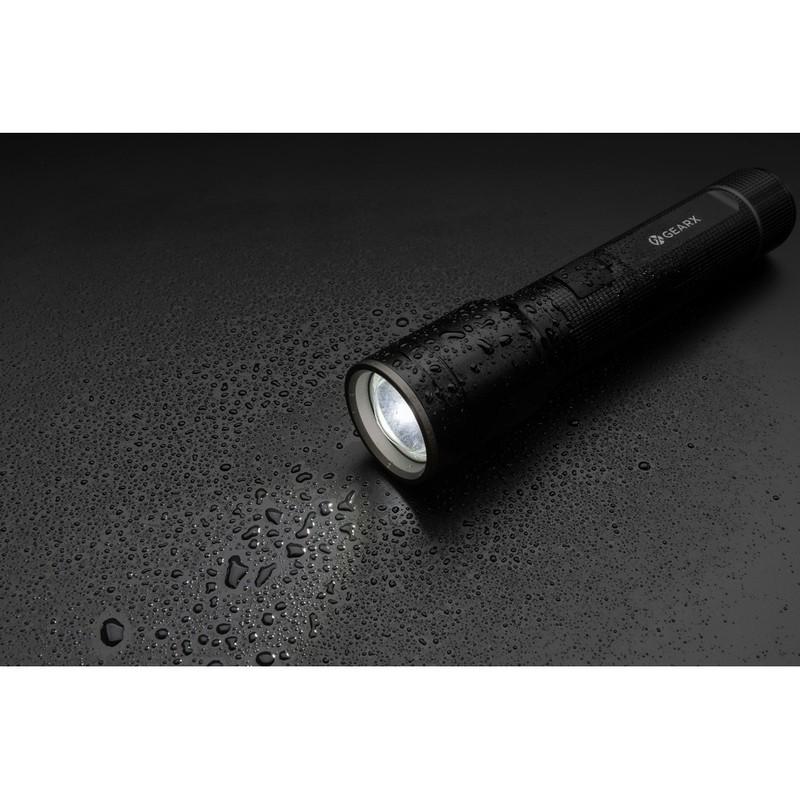 Latarka 10W o bardzo jasnym świetle, wodoodporna IP4, wiązka 1500 lumenów sięgająca do 800 m, wysokiej jakości żarówka z 5 trybami świecenia, w tym SOS, wbudowany akumulator 4000 mAh pozwala na około 10 godzin ciągłego świecenia, ładowana za pomocą USB, wykonana z aluminium z recyklingu z certyfikatem RCS, całkowita zawartość materiałów z recyklingu obliczona w oparciu o wagę całkowitą przedmiotu: 20%, w pudełku z papieru kraftowego z certyfikatem FSC® mix