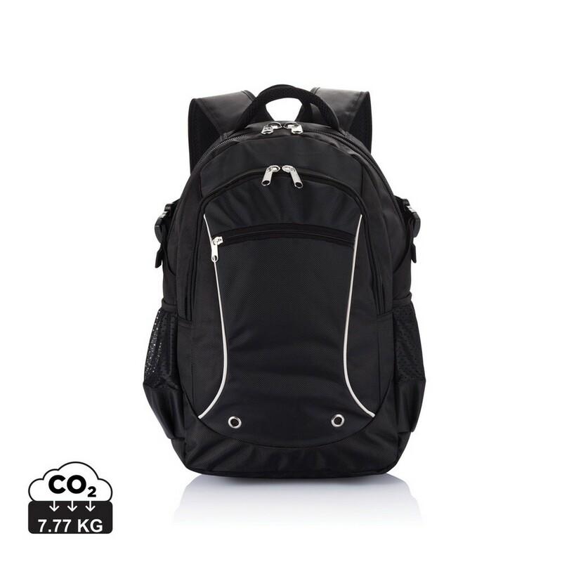 Plecak na laptopa 15,6", wykonany z poliestru 1680D i żakardu, przednia kieszeń z organizerem na zamek błyskawiczny, przegroda główna na laptopa do 15,6", odblaskowe elementy, siateczkowe kieszonki po obu stronach, nie zawiera PVC